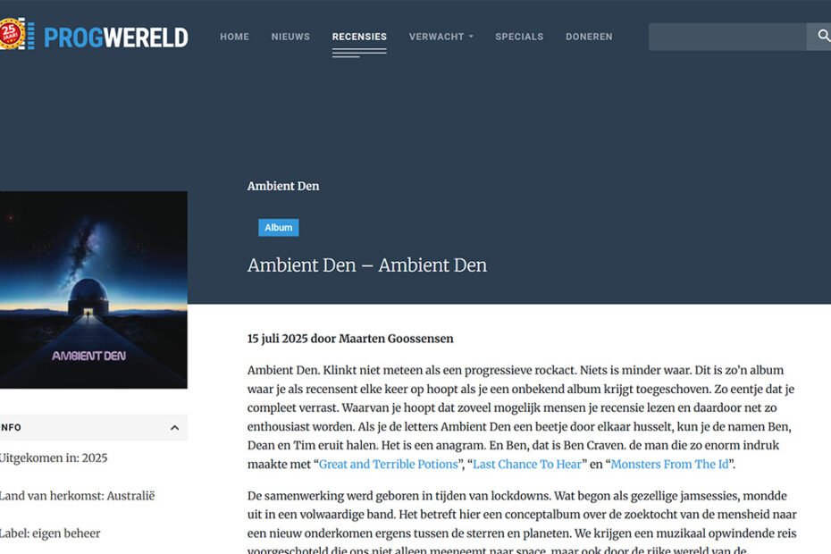 Ambient Den. Klinkt niet meteen als een progressieve rockact. Niets is minder waar. Dit is zo’n album waar je als recensent elke keer op hoopt als je een onbekend album krijgt toegeschoven. Zo eentje dat je compleet verrast. Waarvan je hoopt dat zoveel mogelijk mensen je recensie lezen en daardoor net zo enthousiast worden. Als je de letters Ambient Den een beetje door elkaar husselt, kun je de namen Ben, Dean en Tim eruit halen. Het is een anagram. En Ben, dat is Ben Craven. de man die zo enorm indruk maakte met “Great and Terrible Potions”, “Last Chance To Hear” en “Monsters From The Id”.