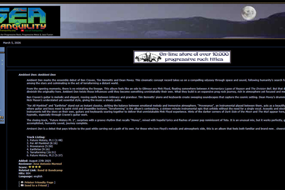 From the opening moments, there is no mistaking the lineage. This album feels like an ode to Gilmour-era Pink Floyd, floating somewhere between A Momentary Lapse of Reason and The Division Bell. But that does not diminish the originality here. Ambient Den twists those influences until they become something unmistakably their own. What they build is an expansive prog rock journey, rich in atmosphere yet focused and melodic.