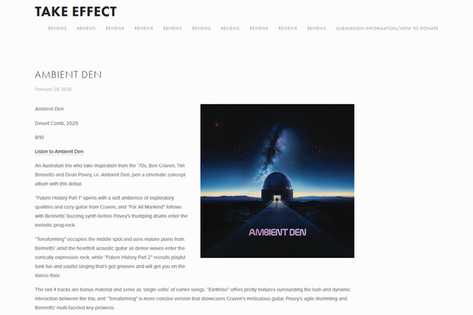 An Australian trio who take inspiration from the ‘70s, Ben Craven, Tim Bennetts and Dean Povey, i.e. Ambient Den, pen a cinematic concept album with this debut.